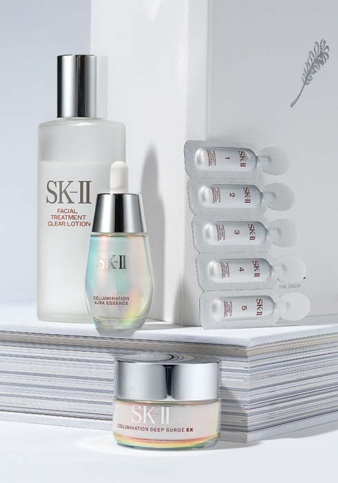 SK-II 집중적인 화이트닝 케어로 환한 안색 만들기. 페이셜 트리트먼트 클리어 로션(150ml 7만원대), 셀루미네이션 오라 에센스(30ml 17만원), 셀루미네이션 딥 서지 EX(50g 15만원대), 화이트닝 스팟 스페셜리스트 컨센트레이트(28pcs 17만원대).