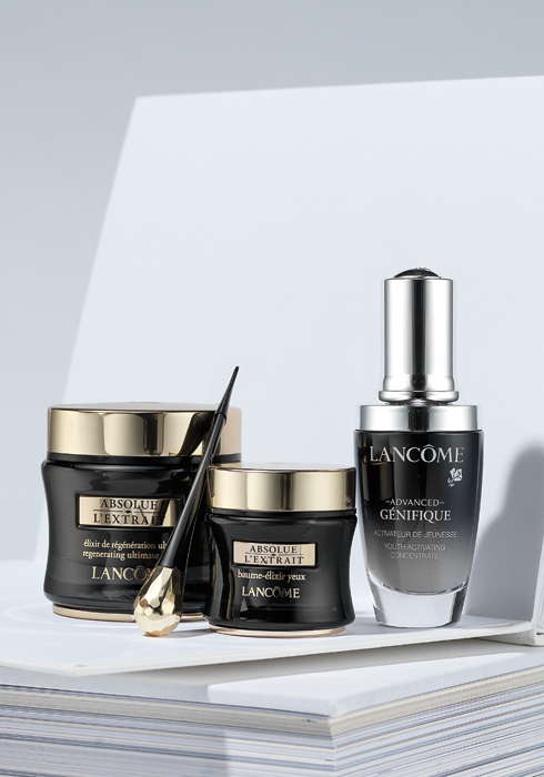 랑콤 예단 화장품으로 제격인 초고가 안티에이징 라인. 압솔뤼 렉스트레(50ml 52만원대), 압솔뤼 렉스트레 아이(15ml+아이 패치 6개 36만원), 어드밴스드 제니피끄(30ml 11만원대).