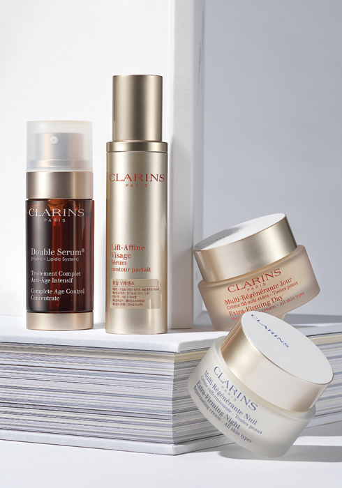 클라란스 식물 성분으로 컨투어링과 안티에이징을 동시에 해결한다. 더블 세럼(30ml 12만원), 토탈 V 에센스(50ml 9만4천원), 엑스트라-퍼밍 데이 크림(50ml 11만원), 엑스트라-퍼밍 나이트 크림(50ml 11만원).