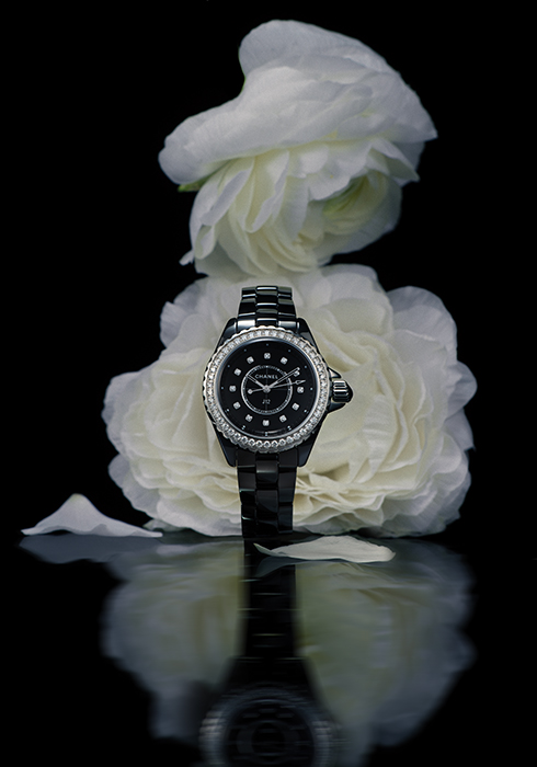 블랙 세라믹과 스틸로 완성한 가장 클래식하고 모던한 디자인의 워치로 지름 38mm 케이스를 갖췄으며, 블랙 세라믹 브레이슬릿을 매치해 통일감을 부여했다. 셀프 와인딩 기계식 무브먼트인 칼리버 12.1로 구동하는 J12 워치 칼리버 12.1 38MM 1천1백40만원대 샤넬 워치.