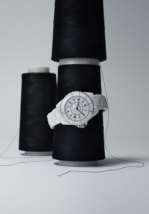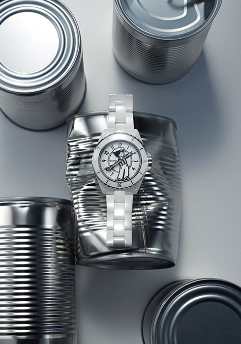 화이트 세라믹과 스틸 베젤에 화이트 래커 다이얼을 매치하고 중앙에 마드모아젤 샤넬 일러스트를 담아 위트를 더한 마드모아젤 J12 라 파우자 워치 38MM 1천4백90만원 샤넬 워치. 문의 080-805-9628, www.chanel.com
