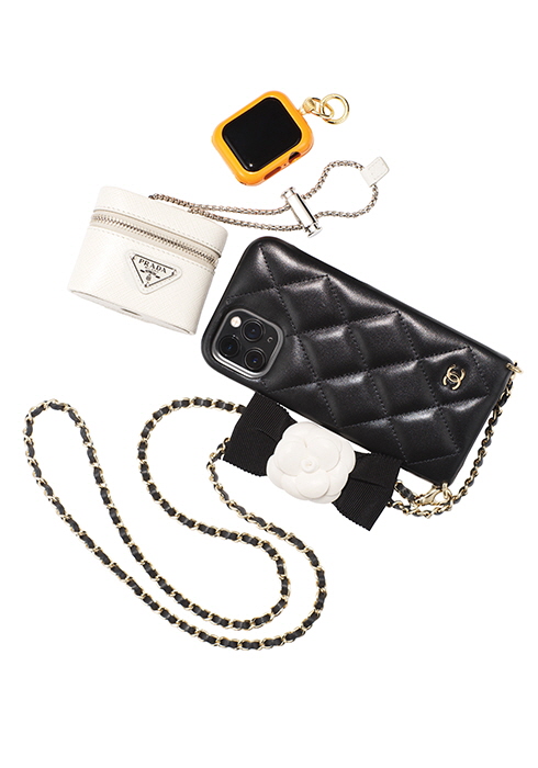오렌지 에나멜드 메탈 소재 스마트 워치 케이스 85만원 펜디. 문의 02-514-0652. 지퍼 클로저로 여닫을 수 있으며, 조절 가능한 체인 스트랩을 장착했다. 아이코닉한 에나멜 메탈 트라이앵글 로고를 장식한 사피아노 가죽 무선 이어폰 케이스 75만원 프라다. 문의 02-3218-5331. 카멜리아 아플리케로 장식한 아이폰 체인 폰 케이스 가격 미정 샤넬. 문의 080-200-2700,chanel.com.