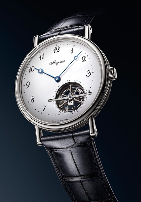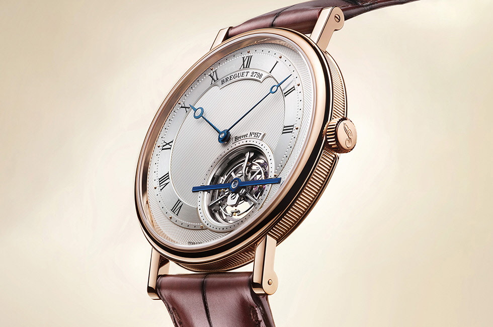 투르비용 워치 중 가장 많은 종류를 생산하는 브랜드는 단연 브레게다. 브레게의 투르비용 워치는 하우스의 순수한 혈통과 역사, 위대한 장인 정신을 담은 결정체로 평가받는다. 몇 세대에 걸쳐 독보적으로 자리매김해온 브레게의 투르비용 워치를 소개한다. 투르비용이 탄생한 지 2백20년 후 선보인 ‘브레게 클래식 투르비용 엑스트라-플랫 애니버서리 5365 워치’는 워치메이킹 분야에서 정확성과 안정성의 새로운 경지를 연 창립자의 발명품에 대한 찬사와 경의를 담고 있다. 아브라함-루이 브레게가 평생에 걸쳐 선보인 투르비용 시계와 동일한 35개로 한정 제작된다. 브레게는 특별한 시기를 기념하는 이 타임피스에 60초 투르비용을 탑재했다. 4시와 6시 사이에서 하나의 축이 초를 가리키는 형태로 구현되었으며, 투르비용에 부착된 카르투슈에는 2백20년 전 특허 취득 당시 부여받은 특허 번호를 나타내는 ‘Brevet No° 157’ 문구가 장식되어 있다. 배럴에는 투르비용 특허에 대한 찬사가 드러나는 ‘Anniversaire 1801–2021’ 문구가 각인되어 있고, 투르비용 하단 브리지의 각 타임피스 고유 번호 옆에 새긴 ‘Brevet No° 157 Du 7 Messidor An IX’ 문구에도 특별한 발명품을 기념하는 의미를 담겨 있다.
