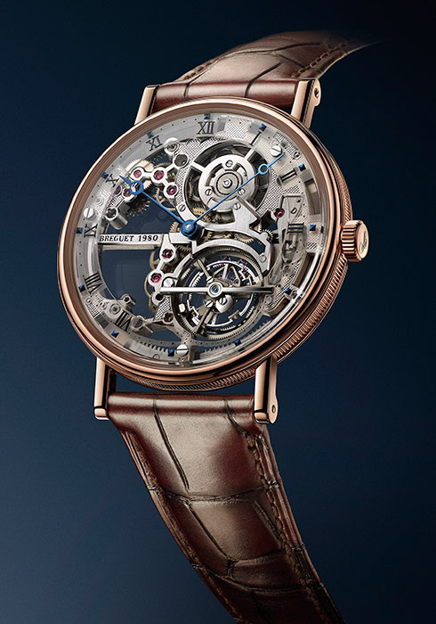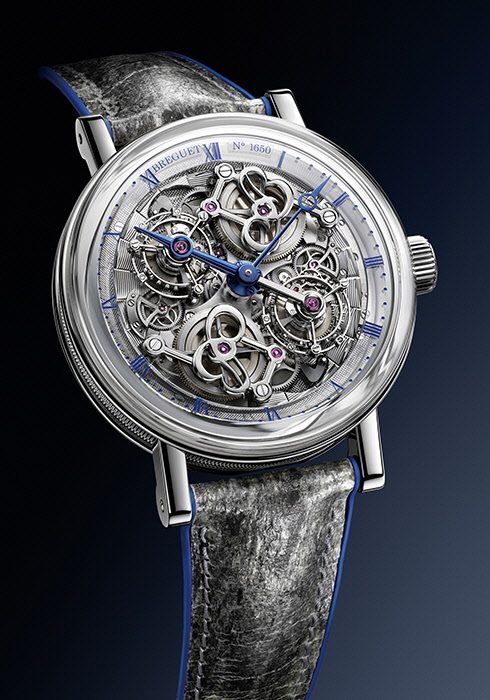 극도로 얇은 3mm 칼리버를 스켈레톤 디자인으로 설계해 브레게 워치메이커의 놀라운 기술력을 세상에 또 한번 알린 ‘브레게 클래식 투르비용 엑스트라-플랫 스켈레트 5395 워치’는 투르비용 디자인을 완전히 새롭게 디자인해 독특한 건축적 구조를 보여준다. 가능한 한 많은 소재와 부분을 제거하는 동시에 부품의 기술적 특징을 그대로 고수한 엑스트라-신 581 칼리버의 무게는 0.29g에 그친다. 이 무브먼트가 특별한 또 하나의 이유는 탁월한 장식과 마감에 있다. 손으로 완성한 엔진-터닝과 기요셰 디자인으로 꾸민 무브먼트 표면은 한 치의 오차도 없이 완벽한 균형미와 정교함을 보여준다. 날카로운 가장자리는 45도 각도로 일정한 사면이 만들어질 때까지 파일을 이용해 일일이 손으로 연마해서 완성한다. 브레게 투르비용을 대표하는 마지막 시계는 탁월한 기계공학적 기술력과 미적 예술성을 동시에 느낄 수 있는 ‘브레게 클래식 더블 투르비용 5345 퀘드올로지 워치’다. 브레게 매뉴팩처는 제한된 공간 안에 물리법칙을 뛰어넘는 정교하고 조화로운 우주를 담아냈다. 다이얼에서 해방되어 기계식의 아름다움을 온전히 드러낸 무브먼트는 12시간 간격으로 회전하며, 2개의 독립적인 투르비용은 1분마다 1회 간격으로 회전해 동력을 전달한다. 모든 부품은 전문적인 수공 폴리싱, 챔퍼링 및 새틴 브러싱 작업을 거쳐 완성했다. 이 타임피스의 미학적 백미는 케이스 백에 있다. 1775년 이후 아브라함-루이 브레게가 일평생 작품을 만들어낸 그의 파리 퀘드올로지 39번가 공방 건물 정면을 수작업으로 새겨 넣었다.