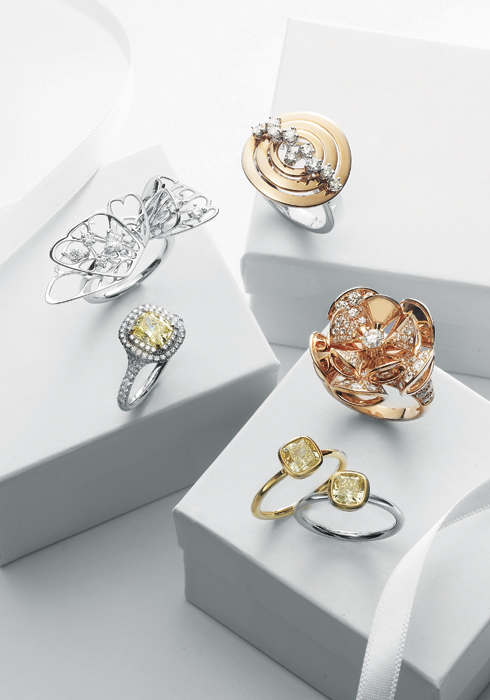 섬세한 나비 날개 위에 다이아몬드를 세팅한 어플러터 링 9백20만원대 타사키. 옐로 다이아몬드 주변에 다이아몬드를 비드 세팅해 빈티지하게 표현한 솔리스트 링, 쿠션 컷 옐로 다이아몬드를 세팅한 베젯 링 모두 가격 미정 티파니. 핑크 골드에 다이아몬드를 세팅해 화려하고 볼드한 플라워를 완성한 디바 컬렉션 링 2천만원대 불가리. 핑크 골드로 동심원을 만들고 그 위에 다이아몬드를 세팅한 소피아 로렌 링 6백만원대 다미아니.