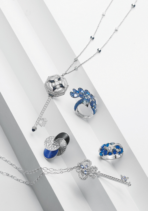 블랙 오닉스를 세팅한 다이아몬드 블랙 오닉스 옥타곤 키 네크리스 4천만원대 티파니. 블루 사파이어로 화려한 공작의 날개를 표현한 헤라 링 3천만원대 부쉐론. 11개의 블루 사파이어 7캐럿과 다이아몬드를 세팅해 행운을 상징하는 유성을 표현한 꼬메뜨 링 3천7백33만원 샤넬 화인 주얼리. 블루 컬러 탄자나이트를 세팅한 인챈트 드래곤플라이 키 네크리스 1천만원대 티파니. 화이트 골드에 블랙 오닉스, 라피스 라줄리, 다이아몬드를 세팅해 독특한 무드로 완성한 파리 누벨바그 컬렉션 링 2천6백만원대 까르띠에.