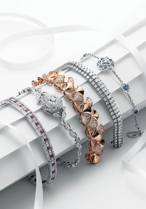 최상급 루비와 다이아몬드를 세팅한 빈티지 스타일 벨 에포크 컬렉션 브레이슬릿 2천만원대 다미아니. 1백83개의 브릴리언트 컷 다이아몬드로 동백꽃을 표현한 까멜리아 오트 쿠튀르 브레이슬릿 4천9백34만원 샤넬 화인 주얼리. 핑크 골드에 다이아몬드를 세팅한 볼륨감 있는 디바 브레이슬릿 4천만원대 불가리. 13캐럿 이상의 다이아몬드를 심플하게 세팅한 델리케이트 브레이슬릿 가격 미정 부쉐론. 블루 컬러 아콰마린과 블루 사파이어로 동백꽃을 묘사한 브레이슬릿 1천1백69만원 샤넬 화인 주얼리.