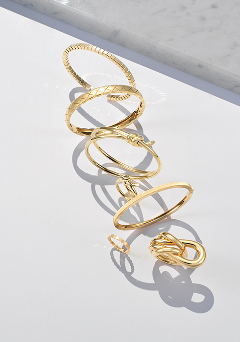 뉴욕의 건축물에서 영감을 얻은 유연하고 구조적인 형태가 돋보이는 주얼리로 매듭 디테일과 크로스 보디가 유기적으로 연결된 더블 랩 디자인이 하나의 아이덴티티를 이룬다. 반지와 브레이슬릿을 레이어링하면 더욱 풍성하게 주얼리 스타일링을 완성할 수 있다. 브레이슬릿 1천1백만원대, 링 3백만원대. 문의 02-6250-8620