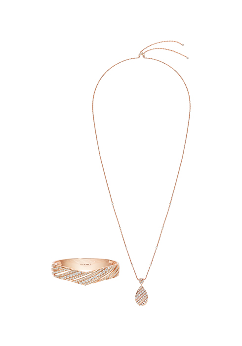 공간을 넘나드는 다양한 세팅의 다이아몬드 라인으로 구성된 트롱프뢰유 페어 모티브는 섬세하게 엮은 레이스를 연상시키며 여성스럽고 우아한 매력을 배가한다. 작품 뒷면의 오픈워크 디테일은 그래픽 모티브에서 착안했으며 다이아몬드 광채를 극대화하는 데 도움을 준다. 18K 로즈 골드에 총 4.68캐럿의 브릴리언트 컷 G VS+ 다이아몬드 2백33개를 세팅한 조세핀 아그레뜨(Joséphine Aigrette) 브레이슬릿과 18K 로즈 골드에 브릴리언트 컷 G VS+ 다이아몬드 총 3.34캐럿 95개를 세팅한 조세핀 아그레뜨 펜던트. 문의 02-3442-3359