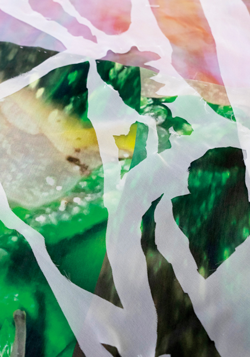 오가영,’Web (in Pink, Green and 0)'(2023), 311x200cm, 보일 천, 피그먼트 프린트, 실크, 실크사, 면실, 털실, 이미지 제공_지갤러리