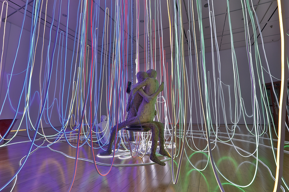 김영진, ‘LED불빛사잉의 휴대폰 남녀'(2018), 80x80x250cm, Paper, mixed media. 이미지 제공_대구미술관