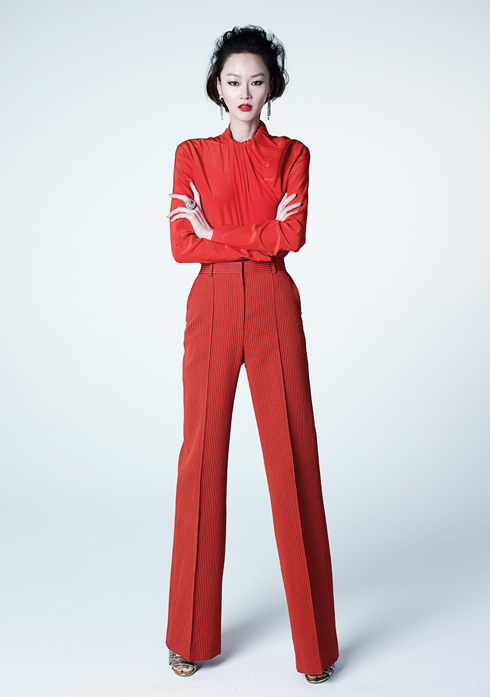 레드 블라우스와 레드 스트라이프 와이드 팬츠 모두 셀린.