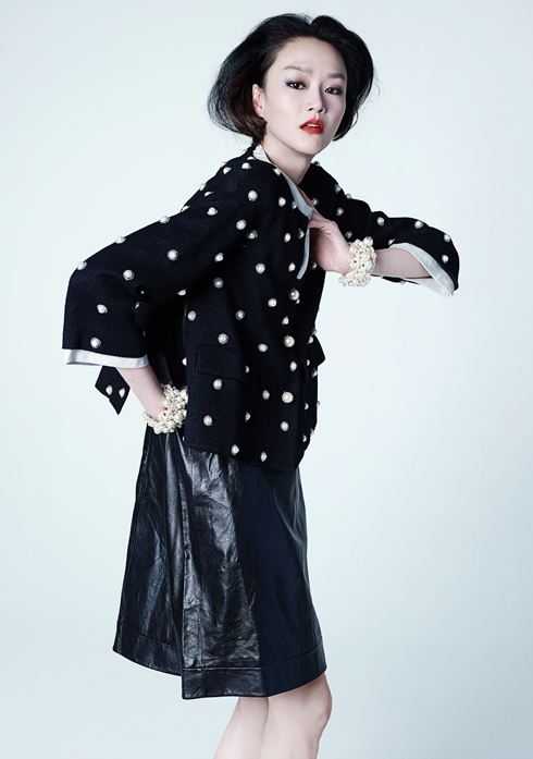 진주 디테일의 블랙 재킷, 블랙 가죽  스커트, 진주 브레이슬릿 모두 가격 미정 샤넬.