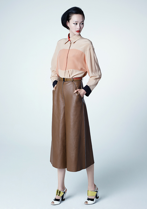 베이지와 오렌지 배색 블라우스 2백9만원, 브라운 가죽  팬츠 3백66만원, 컬러 블록 스터드 슈즈 가격 미정 모두 펜디.