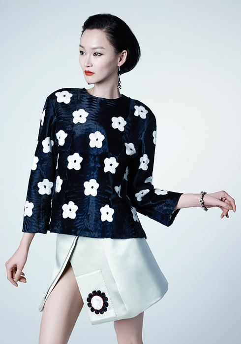 플라워 프린트 블랙 모피 소재 톱, 민트 컬러 새틴 스커트 가격 미정, 플라워 모티브 장식 이어링과 브레이슬릿 각각 1백만원대 모두 프라다.