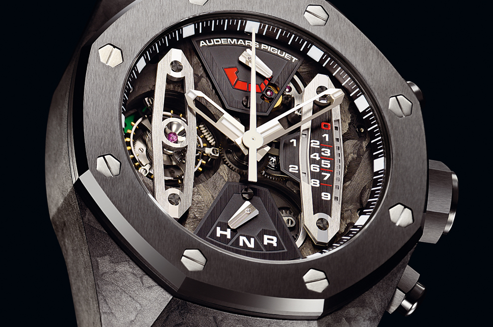 오데마 피게의 독보적 기술력이자 브랜드의 보석 ‘포지드 카본’을 케이스와 무브먼트 브리지, 메인 플레이트에 사용했다. 외부 충격에 강하고 가볍다는 것이 가장 큰 장점이다. 별도의 피니싱 없이 실크의 질감을 표현한 모델.