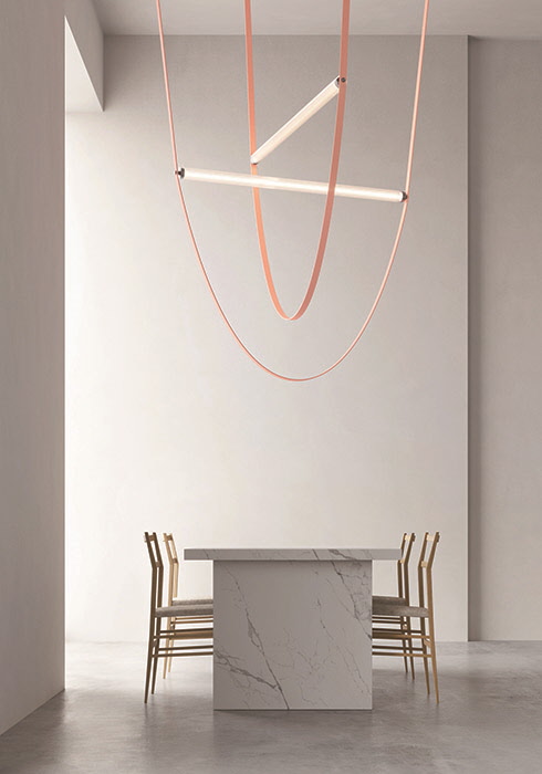 2 이탈리아의 대표적인 조명 브랜드 플로스(FLOS)가 예술적인 디자인으로 유명한 디자인 듀오 포르마판타스마(Formafantasma)와 협업해 내놓은 조명 ‘WireLine’. 고무 소재의 줄이 U자로 드리운 가운데 LED 램프가 달린 모양이 독특하다.