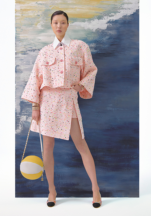 화사한 컬러와 장식적 디테일이 돋보이는 트위드 재킷과 스커트, 커다란 칼라를 더한 코튼 트윌 소재 화이트 셔츠, 카프 스킨 소재 비치볼 핸드백, 컬러풀한 프린트를 입힌 메시 소재로 멋을 낸 카프 스킨 슬링백, 오른쪽 손목에 착용한 로고 장식 램 스킨 브레이슬릿, 왼쪽 손목에 착용한 투명한 글라스 뱅글 모두 샤넬.