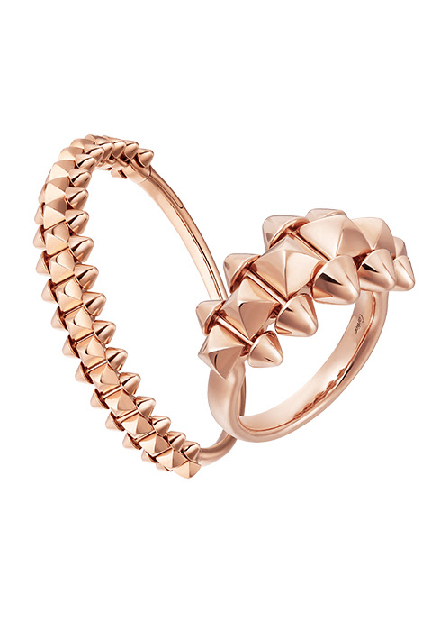 자신만의 확고한 개성을 드러내기를 원하는 밀레니얼 세대의 취향을 저격한 까르띠에만의 독창적인 주얼리, 클래쉬 드 까르띠에를 소개한다. 클래식한 형태를 벗어난 과감한 스타일과 반대되는 간결한 라인이 조화를 이루며 스타일에 포인트를 주면서도 이질감 없이 어느 룩에나 연출하기 좋다. 겉은 뾰족해 보이지만 부드럽고 편안한 착용감을 선사하며 기하학적인 매력과 동시에 우아하고 여성스러운 느낌까지 더한다. 18K 핑크 골드 소재로 이뤄져 있다. 브레이슬릿 1천6백만원대, 링 6백20만원대. 문의 1566-7277