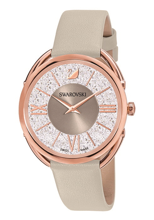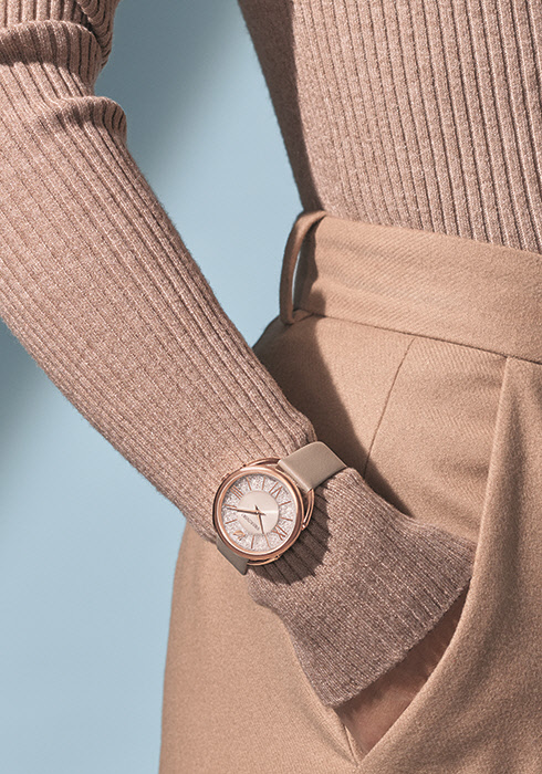 손목 위 크리스털은 움직일 때마다 다른 빛으로 반짝여 더욱 매력적이다. 마치 볼드한 뱅글 같기도 해 얇고 가는 체인 브레이슬릿 여러 개와 매치하면 트렌디하기까지 하다. 8백 개 이상의 클리어 크리스털이 토프 선레이 다이얼과 대비되어 모던한 반짝임을 선사하는 ‘크리스탈린 글램’ 워치는 로즈 골드 컬러 스틸 케이스와 로마숫자 인덱스를 더해 스와로브스키만의 유니크한 디자인을 완성했다. 천연 레더 스트랩은 어떤 계절, 어떤 옷에나 잘 어울리는 토프 컬러로, 자연스러운 멋을 선호하는 사람에게 선물하면 좋다. 에디터 장라윤