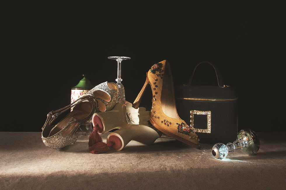 투명한 크리스털 샴페인 글라스 가격 미정 에르메스. FF 로고를 플라워 모티브 컬러 크리스털로 장식한 회화적인 느낌의 펌프스 가격 미정 펜디. 숄더 스트랩, 톱 핸들로 다양한 스타일링이 가능하도록 고안한 미니 사이즈 베니티 벨벳 백 2백67만원 로저 비비에.