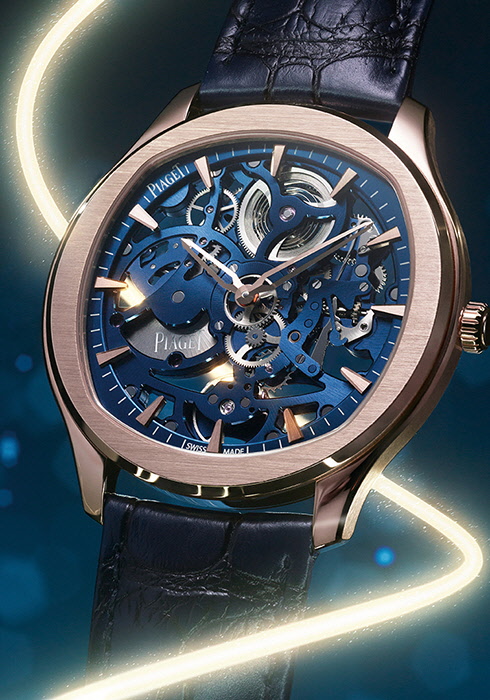 01 피아제 폴로 스켈레톤 워치 42mm 피아제는 안이 훤히 들여다보이는 스켈레톤 워치를 제작해 하이엔드 워치메이킹의 정수를 보여줬다. 42mm의 케이스는 18K 핑크 골드로 완성했으며, 우아한 다크 블루 컬러의 무브먼트는 핑크 골드 케이스와 아름다운 대비를 이룬다.