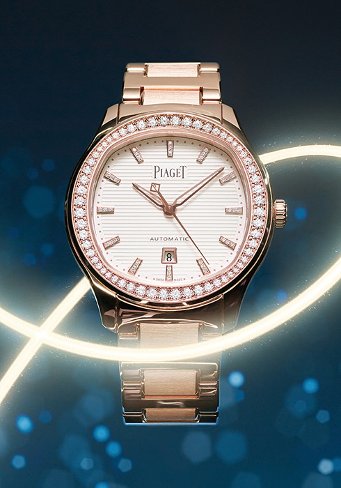 02 피아제 폴로 데이트 36mm 18K 핑크 골드 케이스 베젤에는 60개의 브릴리언트 컷 다이아몬드를, 화이트 기요셰 장식의 오팔린 다이얼에는 36개의 브릴리언트 컷 다이아몬드를 세팅했다. 시계에 장착한 501P 셀프 와인딩 무브먼트는 든든한 40시간의 파워 리저브를 제공하며, 사파이어 백 케이스로는 아름다운 무브먼트의 움직임을 감상할 수 있다.