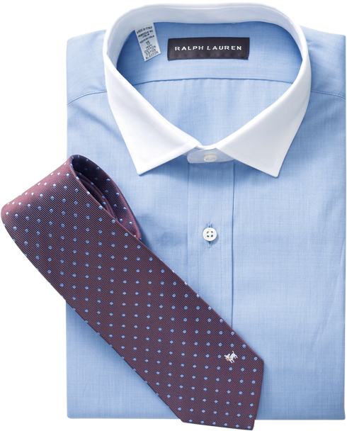 3 쇼트 칼라가 감각적인 블루 셔츠 46만8천원 랄프 로렌. 버건디 컬러 블루 도트 타이 10만9천원 카운테스 마라.