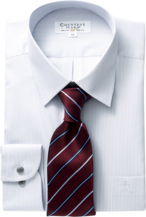 7 스트라이프 패턴이 베이식한 화이트 셔츠 13만9천원, 와인 컬러 사선 패턴 실크 타이 10만9천원 모두 카운테스 마라.