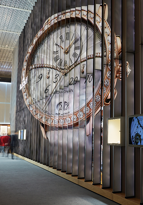 브랜드의 상징적인 워치를 외벽 전면에 스크리닝한 블랑팡 부스.