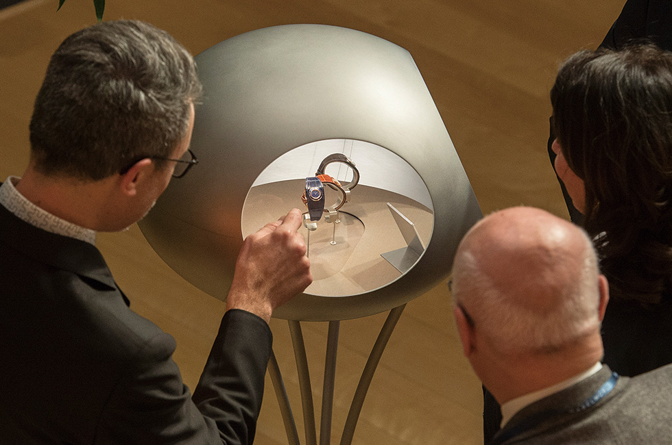 ‘파빌리온’이라고 불리며 아름다운 디자인을 뽐내는 에르메스 부스에서 시계를 살펴보고 있는 관람객들.
