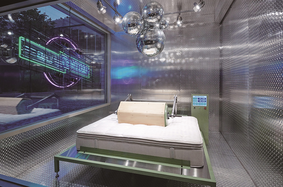 숙면에 대한 시몬스의 오랜 노하우와 연구의 흔적은 시몬스 테라스 곳곳에서 마주할 수 있다. 삶의 질을 높이고 수면에 도움을 주는 식물을 재배하는 ‘팜 가든’은 완벽한 숙면을 이루기 위한 다양한 방식을 시몬스만의 감성으로 풀어낸 아름다운 결과물이다. 또 격 높은 숙면의 연장선상으로 다양한 문화활동을 선보일 특별 전시 공간에서는 테라스 오픈을 기념한 오프닝 프로젝트로 일러스트레이터 장 줄리앙이 그려낸 <장 줄리앙: 꿈꾸는 남자> 전시를 개최한다. 팜 가든, 전시 공간을 지나 시몬스 테라스 건물의 핑크색 문을 열고 1층으로 들어서면 영화 <위대한 개츠비> 속 저택을 연상시키는 럭셔리하고 화려한 ‘시몬스 호텔’이 눈에 들어온다. 레트로 컬처가 풍성했던 1960~70년대 미국 문화에서 영감을 받아 꾸민 시몬스 호텔 내부에는 시몬스의 최상위 매트리스 컬렉션인 뷰티레스트 블랙의 전 제품이 전시되어 있다. 더불어 이 최상위 매트리스를 구성한 자재와 포켓스프링을 직접 만져보고 경험하는 쇼룸이 마련되어 한국 시몬스의 독보적인 기술력과 브랜드가 전하고자 하는 정체성을 확인할 수 있다. 이와 함께 시몬스 수면연구 R&D센터의 장인 정신, 숙면에 대한 고민 등을 보다 친근하게 느낄 수 있는 공간인 ‘매트리스 랩’에서는 시몬스의 독보적인 매트리스 설계 노하우인 조닝과 레이어링 기술을 체험할 수 있다. 다양한 타입의 매트리스에 직접 누워볼 수 있는 것은 물론, 시몬스가 이끄는 다양한 수면 트렌드를 재미난 영상과 디스플레이를 통해 보다 쉽게 파악할 수 있다는 점도 매력 포인트다. 특히 입구에 마련된, R&D 기술력을 소개하는 공간에는 롤러 테스트기와 클럽에 있을 법한 미러 볼을 결합한 반전 매력의 디스플레이를 적용해보는 재미까지 더했다.