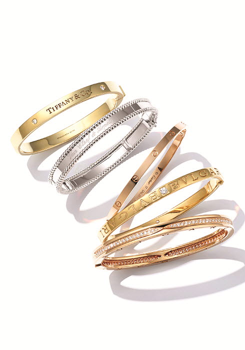 불가리 이니셜이 새겨져 있는 옐로 골드 불가리 불가리 브레이슬릿 8백만원대, 로즈 골드에 다이아몬드를 세팅한 비제로원 브레이슬릿.