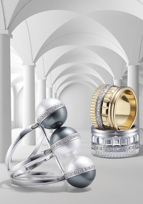 | (왼쪽부터) 11mm 크기의 최상급 남양 흑접 진주와 남양 백접 진주를 대비를 이루도록 배치한 밸런스 유나이티드 2천2백만원대 타사키. 브랜드 창립 1백20주년을 기념해 보다 입체적으로 완성한 쿼트르 래디언트 에디션 링. 각 1천만원대 모두 부쉐론. |