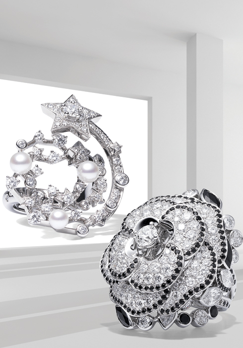 (왼쪽부터) 별 모티브에 진주를 세팅한 꼬메뜨 링 4천만원대, 블랙 다이아몬드와 컬러리스 다이아몬드로 볼륨감 넘치는 동백꽃을 완성한 까멜리아 오트 꾸튀르 링 가격 미정 모두 샤넬 화인주얼리. |