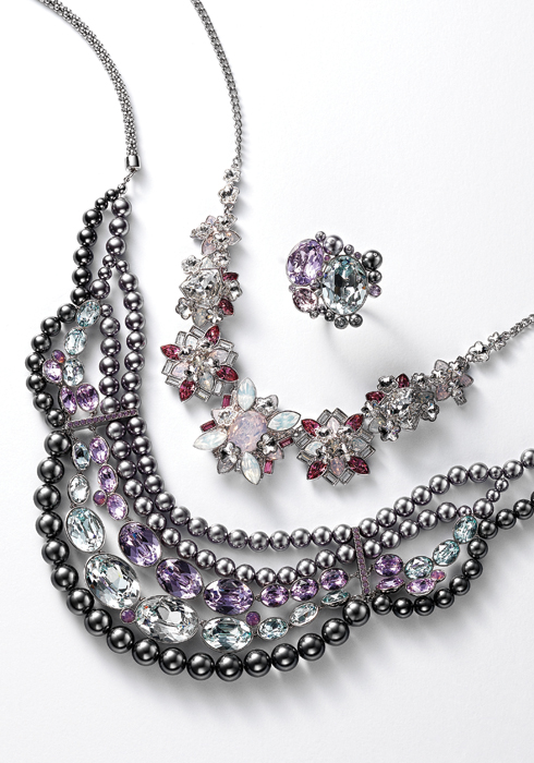 흑진주를 연상케 하는 크리스털 펄과 파스텔컬러의 크리스털이 조화를 이루어 트렌디한 실루엣을 완성한 클레이 네크리스 54만5천원, 파스텔 톤의 크리스털로 감각적인 플라워 모티브를 표현한 칼리 네크리스 37만원, 크리스털 펄과 볼드한 파스텔컬러 크리스털의 조합이 화려한 클레이 링 33만원 모두 스와로브스키.