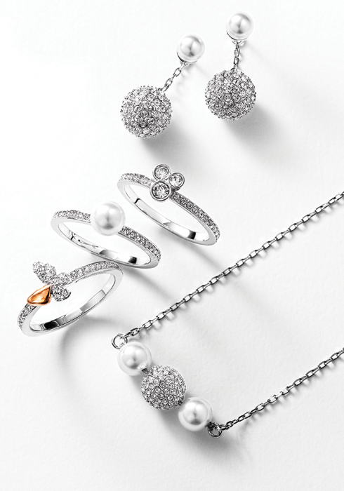나비 모티브의 링과 진주 링, 크리스털 링 3개가 한 세트인 큐트 링 21만5천원, 화이트 크리스털 펄과 크리스털 볼의 매치가 여성스러운 캐노피 이어링 14만5천원, 화이트 크리스털 펄과 화려한 크리스털 볼의 조화가 감각적인 캐노피 네크리스 15만5천원 모두 스와로브스키.