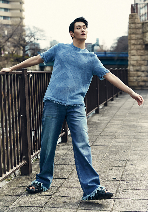 라이트 블루 컬러의 코튼 스웨터 톱 1백22만원, 블루 컬러의 데님 팬츠 1백90만원, 블랙 컬러의 러버 소재 엠보싱 슬라이드 77만원 모두 펜디.