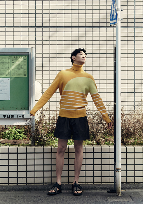 오렌지 컬러의 니트 소재 터틀넥 스웨터, 브라운 컬러의 포플린 소재 쇼츠, 송아지가죽 소재의 샌들 모두 가격 미정 에르메스.