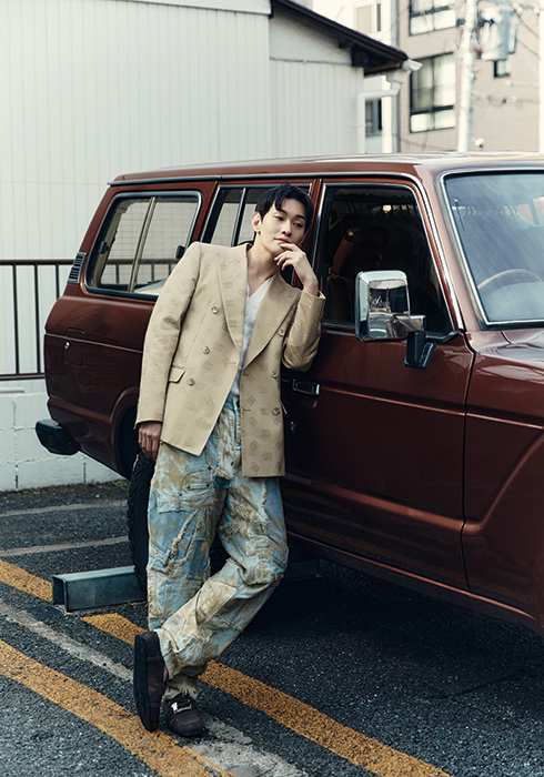 자카드 디테일 더블브레스트 코튼 테일러드 재킷 3백50만원, 그랜드대드 넥 미세 립 코튼 티셔츠 92만원, 패치워크 데님 진 가격 미정, 브라운 컬러 로퍼 가격 미정 모두 돌체앤가바나.