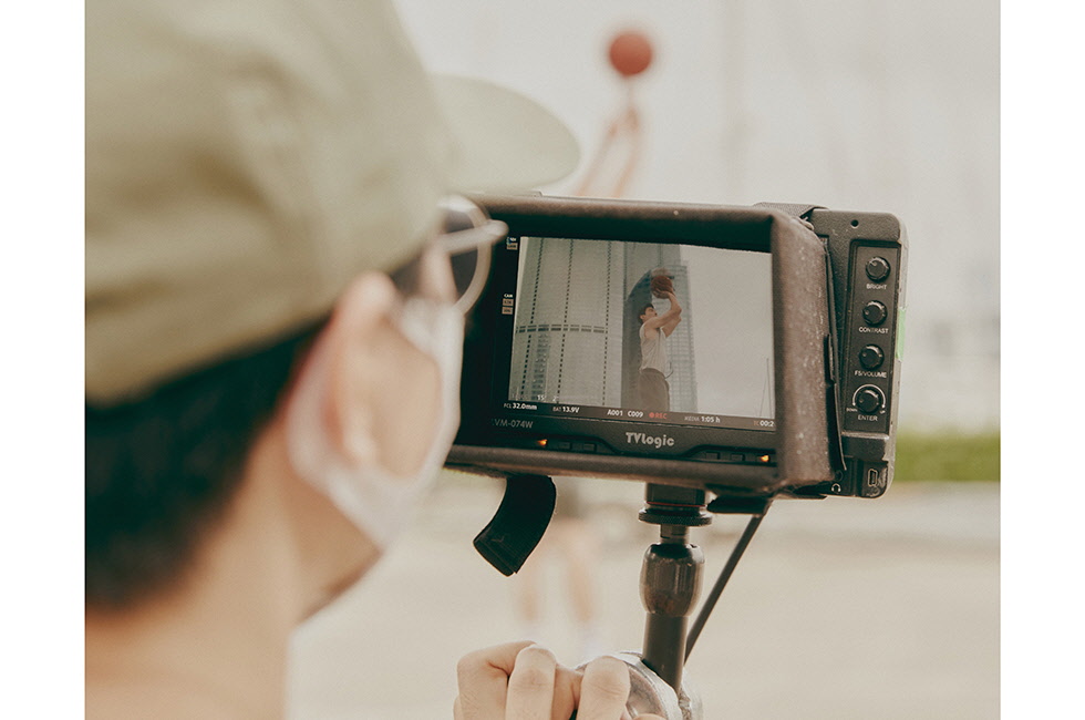 1~4 카키 에비에이션을 착용하고 농구 플레이 콘셉트로 촬영하고 있는 다니엘의 모습.