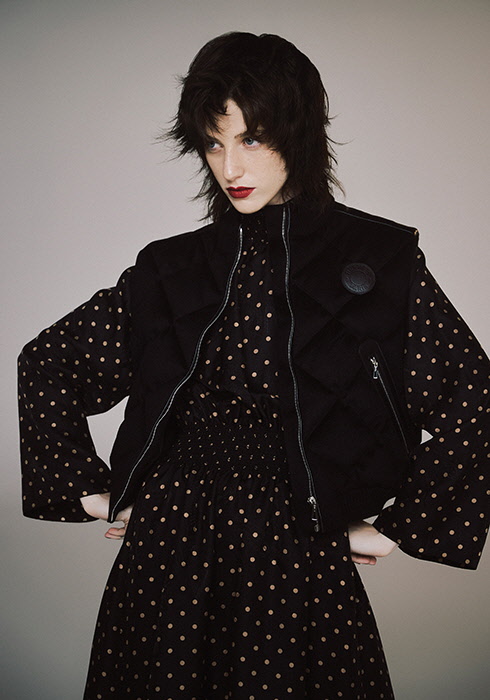 블랙 컬러 다운 베스트, 도트 패턴 실크 드레스 모두 가격 미정 에르메스. |