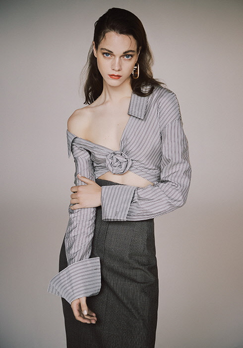 스트라이프 실크 셔츠 3백만원대, 그레이 울 스커트 가격 미정, 골드 이어링 가격 미정 모두 펜디. |