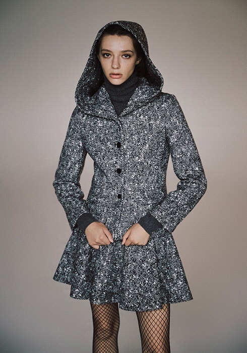 아방가르드한 오버사이즈 코트 5백18만원, 그레이 체크 팬츠 1백38만원, 웨지 앵클부츠 가격 미정, 블랙 큐브 이어링 가격 미정, 실버 네크리스 가격 미정 모두 지방시. |