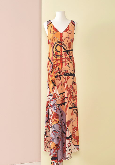 부드러운 실크 스카프를 두른 듯 피부를 따라 흐르는 실루엣이 여성스럽고 아름다운 에르메스의 롱 드레스. 비치 드레스로는 물론 우아한 이브닝 웨어로도 빛을 발할 것. 셔링 디테일과 언밸런스하게 처리한 드레스 끝단이 보디 실루엣을
