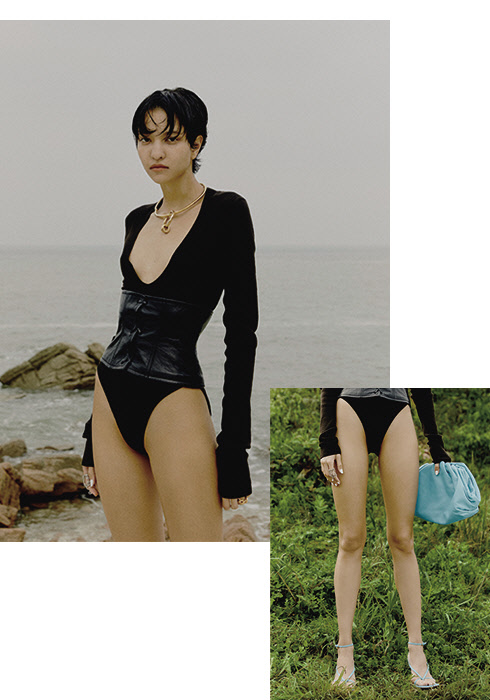 스트레치 울 보디수트 1백16만원, 원형 펜던트 장식의 라운드 네크리스 2백37만원, 왼손 약지에 착용한 링 95만원, 파우치 스타일의 카프 스킨 오버사이즈 클러치 2백93만원, 나파 가죽앵클 스트랩 샌들 90만5천원 모두 보테가 베네타.