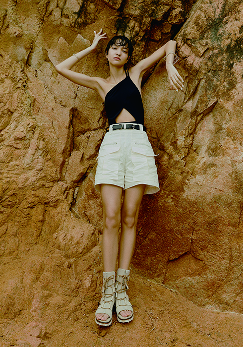 컷아웃 디테일이 멋스러운 블랙 원피스 스윔수트, 빅 포켓 디테일의 화이트 코튼 쇼츠, 블랙 카프 스킨 벨트, 레이스업 부츠 모양의 투박한 샌들, 왼쪽 손목에 착용한 사각 형태 실버 뱅글, 오른쪽 손목에 착용한 실버 브레이슬릿 모두 가격 미정 에르메스.