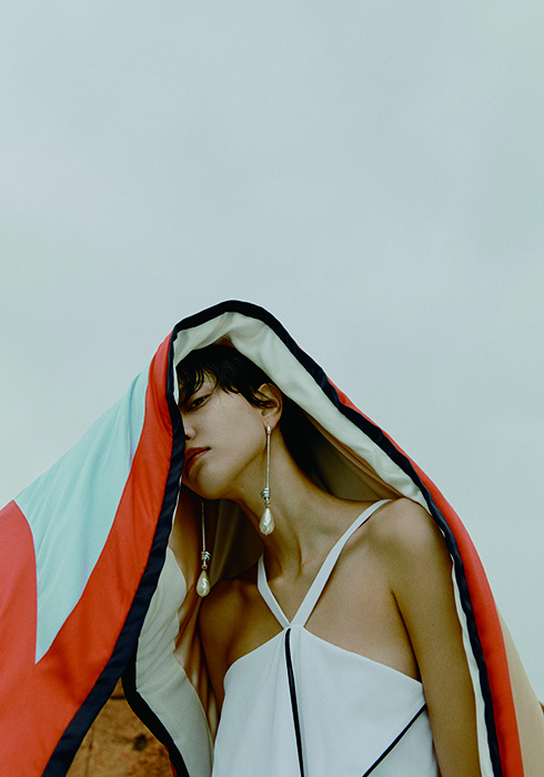 화이트 홀터넥 이브닝드레스 2백49만원, 숄처럼 연출 가능한 컬러 블록 실크 패딩 반다나 91만원, 볼드한 인조 펄을 장식한 팔라듐 드롭 이어링 65만원 모두 버버리.
