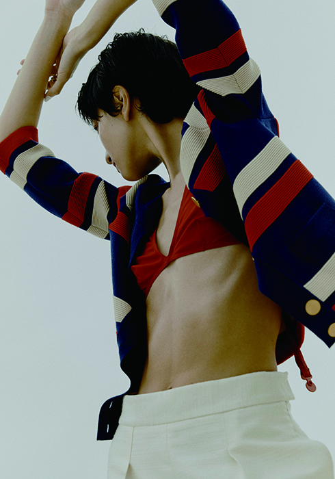 레드 컬러 비키니 톱, 화이트 코튼 팬츠 모두 가격 미정 에르메스.