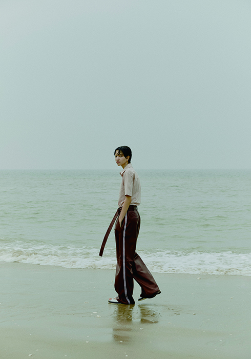 쇼트 슬리브 슬림 핏 핑크 컬러 셔츠 44만원, 옆면에 스트라이프를 더한 나파 가죽 와이드 팬츠 1백93만5천원, 화이트 스트랩 샌들 1백5만원 모두 보스 우먼.